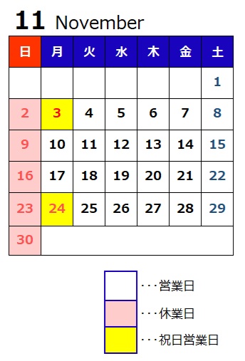 11月の営業日のお知らせです。3日月曜日・24日月曜日ともに祝日ですが、通常営業いたします!